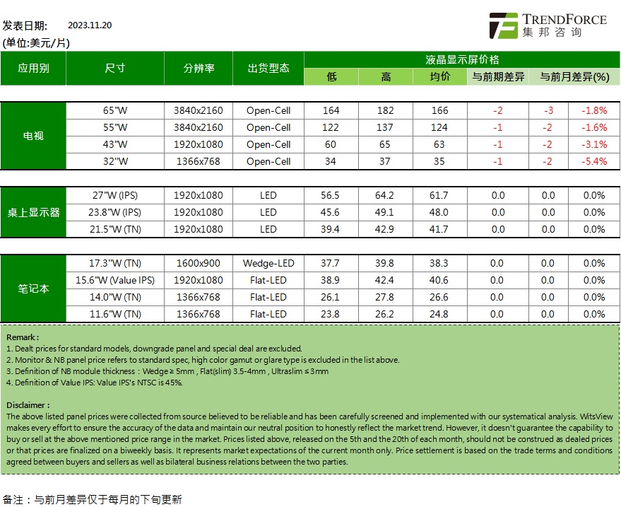 智通财经APP获悉,根据TrendForce集邦咨询调研数据,2023年11月下旬,各尺寸电视面板价格持续下跌,显示器、笔记本面板价格维持不变,具体内容如下: