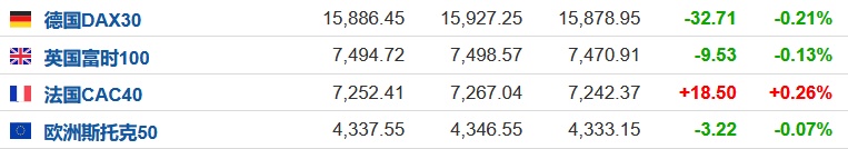2.截至发稿,德国DAX指数跌0.21%,英国富时100指数跌0.13%,法国CAC40指数涨0.26%,欧洲斯托克50指数跌0.07%。