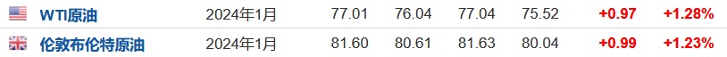 3. 截至发稿,WTI原油涨1.28%,报77.01美元/桶。布伦特原油涨1.23%,报81.60美元/桶。