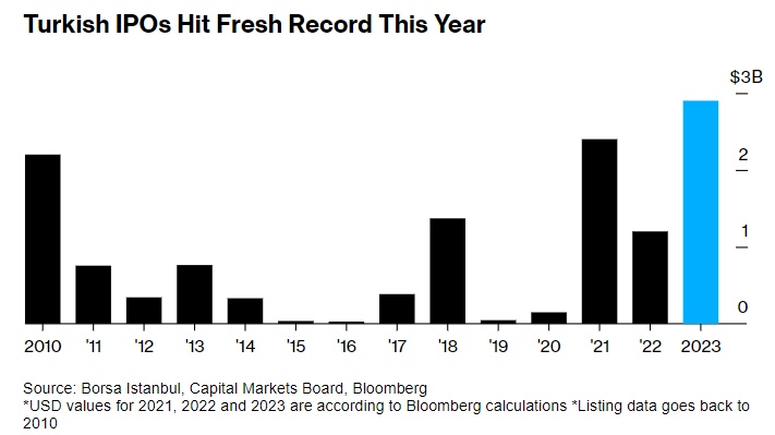 投资新上市的股票尤其受欢迎。在2023年上市的股票中,超过75%的股票在头五个交易日内飙升了约60%。虽然土耳其主要股市今年迄今上涨了45%,但追踪过去两年上市公司的Borsa Istanbul IPO指数却上涨了98%。