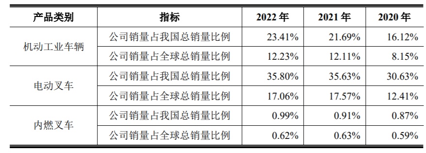 2020年至2022年,公司机动工业车辆在我国市场份额分别为16.12%、21.69%和23.41%。公司深耕电动叉车领域十余年并将电动叉车作为发展重点,在电动叉车领域持续创新并具备一定优势,2020年至2022年,公司电动叉车我国市场占有率达30.63%、35.63%和 35.80%,且我国和全球市场占有率均呈上升趋势。