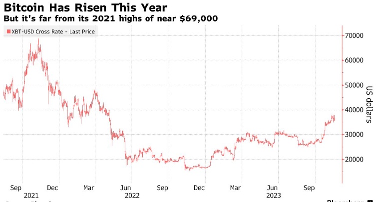 市场预计美国证券交易委员会(SEC)可能会在明年1月中旬或更早之前批准相关ETF,这些基金将以低税收、高成本效益的ETF形式买卖比特币。此前10年,SEC一直拒绝此类申请。乍一看,这为数字资产支持者提供了一条救赎之路。一年前,FTX崩盘引发了该行业最大的生存危机,并让长期主导传统金融的加密货币反对者更加大胆。