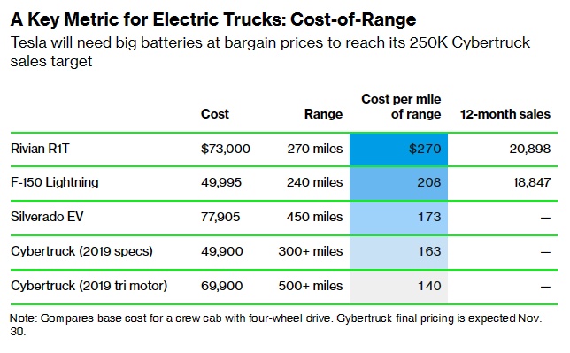 比较皮卡的一个很好的指标是每英里行驶里程的车辆成本。像Rivian R1T这样的豪华探险卡车每英里行驶里程的成本可能更高,但特斯拉对Cybertruck的雄心明显更大。特斯拉表示,它将有能力每年生产25万辆Cybertruck,这是Rivian R1T和福特F-150 Lightning早期年销量的十倍以上。特斯拉想要卖出这么多的Cybertruck,每英里行驶里程的车辆成本就必须达到一流水平,才能吸引皮卡市场的广大用户。