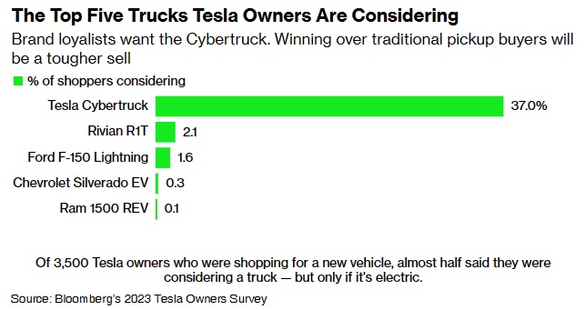 不过,Cybertruck似乎锁定了一个细分市场,那就是已经拥有特斯拉的人。今年年初的一项调查显示,3500名打算在未来两年购买一辆新车的特斯拉车主中(其中许多人此前从未拥有过皮卡),37%的人正在考虑购买Cybertruck。