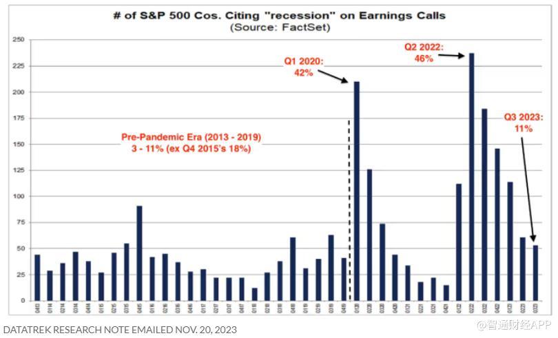 智通财经APP获悉,根据DataTrek Research的一份报告,标普500指数中的公司在第三季度的收益电话会议上提及“衰退”的比例降至11%,远低于去年和2020年的40%以上峰值。这表明,尽管投资者仍关注美国经济能否实现“软着陆”,股市在过去三周内大幅反弹,公司对即将到来的经济衰退的担忧似乎有所减轻。