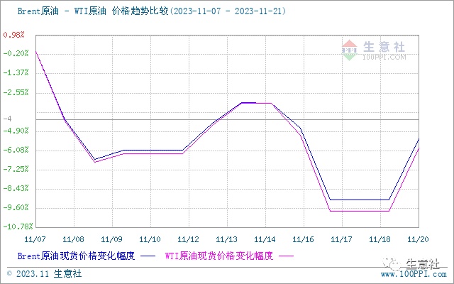 智通财经APP获悉,11月21日,据生意社数据统计显示,本轮国内成品油调价窗口于11月21日24时开启,本轮成品油零售价或将按机制下调,2023年零售价调整已经历“十涨九跌三搁浅”,周期内原油市场行情大幅下滑,变化率负值拉大,国内成品油零售价或将遇“第十跌”。进入本轮计价周期,国际油价走势大幅下滑,截止20日,美国WTI原油期货主力合约结算价报77.83美元/桶,布伦特原油期货主力合约结算价报82.32美元/桶。