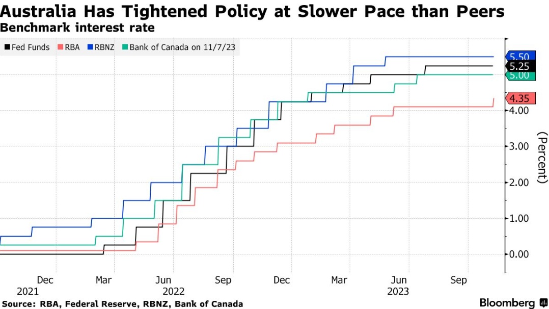 目前,澳洲联储在此次运动中已将借贷成本提高了4.25个百分点,相比之下,美国和新西兰则为5.25个百分点。