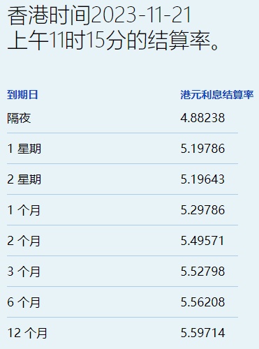 智通财经APP获悉,11月21日,随着年结效益开始显现,港元拆息连续三日全线上扬,其中,隔夜息升至4.88238%,再创逾一个月新高,而与楼按相关的一个月报5.29786%,续见9月29日以来最高,三个月期高见5.52798%,与同期美元LIBOR息差收窄至10基点。长息方面,六个月及一年期分别报5.56208%和5.59714%。