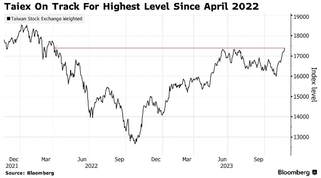 台湾股市11月恢复上涨,全球科技股因押注美联储即将结束紧缩货币政策而受益。
