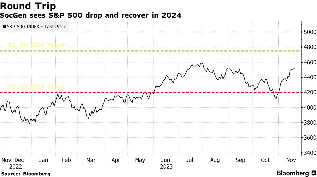 总的来说,美国股市从2022年的暴跌中强劲反弹,因为华尔街在进入2023年时预测的厄运和悲观情绪并未实现。如果明年股市再次上涨,这将是该指数六年来的第五次上涨,唯一的例外是2022年美联储引发的全年下跌。法国兴业银行对2024年标普500指数的年终目标价略低于该指数去年1月创下的历史最高点4,796点。