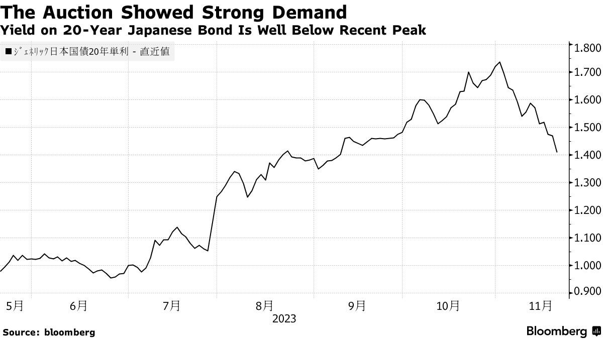 日本10年期国债收益率在此次拍卖后下跌了4.5个基点,至0.695%,为9月以来的最低水平。日本20年期国债收益率已从11月初的1.73%这一十年高点持续稳步降至周二的1.395%。美国和日本的长期国债收益率都面临着下行压力,原因是美国通胀数据低于预期,而日本上季度国内生产总值(GDP)收缩幅度大于预期。