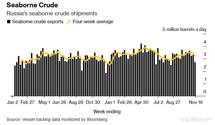 数据还显示,俄罗斯波动较小的四周平均原油出口量降至323万桶/日,较截至11月12日当周的修正数据减少约20万桶/日。这是八周以来的最低水平,但仍比截至8月20日当周的日出口量高出约34万桶,当时俄罗斯的原油出口削减幅度最大。