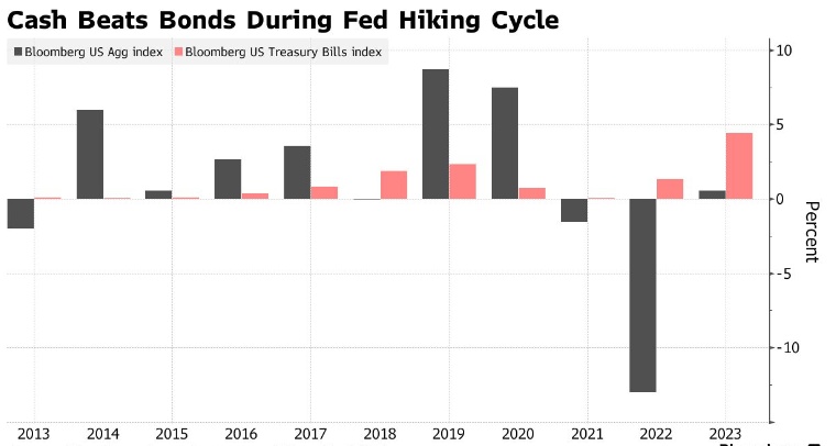 对这些债券经理来说,本月显示出持有现金时间过长的风险。通胀消退和经济增长放缓的迹象推动彭博美国综合指数在11月飙升3.4%,截至11月17日,该指数在2023年恢复到持平水平。不过,这仍远低于现金今年的收入。但这表明,情况可能已经开始改变。