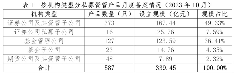 智通财经APP获悉,11月21日,中基协发布数据显示,2023年10月证券期货经营机构当月共备案私募资管产品587只,设立规模339.45亿元。从机构类型看,10月备案私募资管产品设立规模最大的为证券公司及其资管子公司。证券公司私募子公司10月备案的16只私募基金均为合伙型。