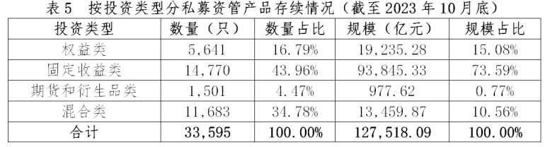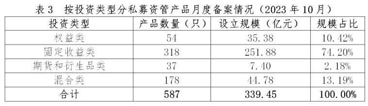 从投资类型看,10月备案私募资管产品数量最多、设立规模最大的为固定收益类。