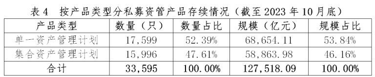 从产品类型看,10月存续单一资产管理计划规模占比为53.84%。