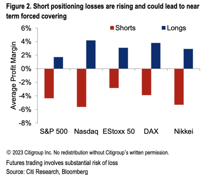 智通财经APP获悉,花旗的量化团队表示,近期股市涨势的迅猛步伐令许多空头措手不及,股市可能随着空头仓位出清而进一步上涨。花旗全球量化研究主管Chris Montagu表示,尽管全球股市情绪普遍乐观,但“传统空头头寸的风险依然存在,尤其是最近美国股市反弹导致标普500指数空头头寸损失不断上升,增加了短期轧空的风险。”