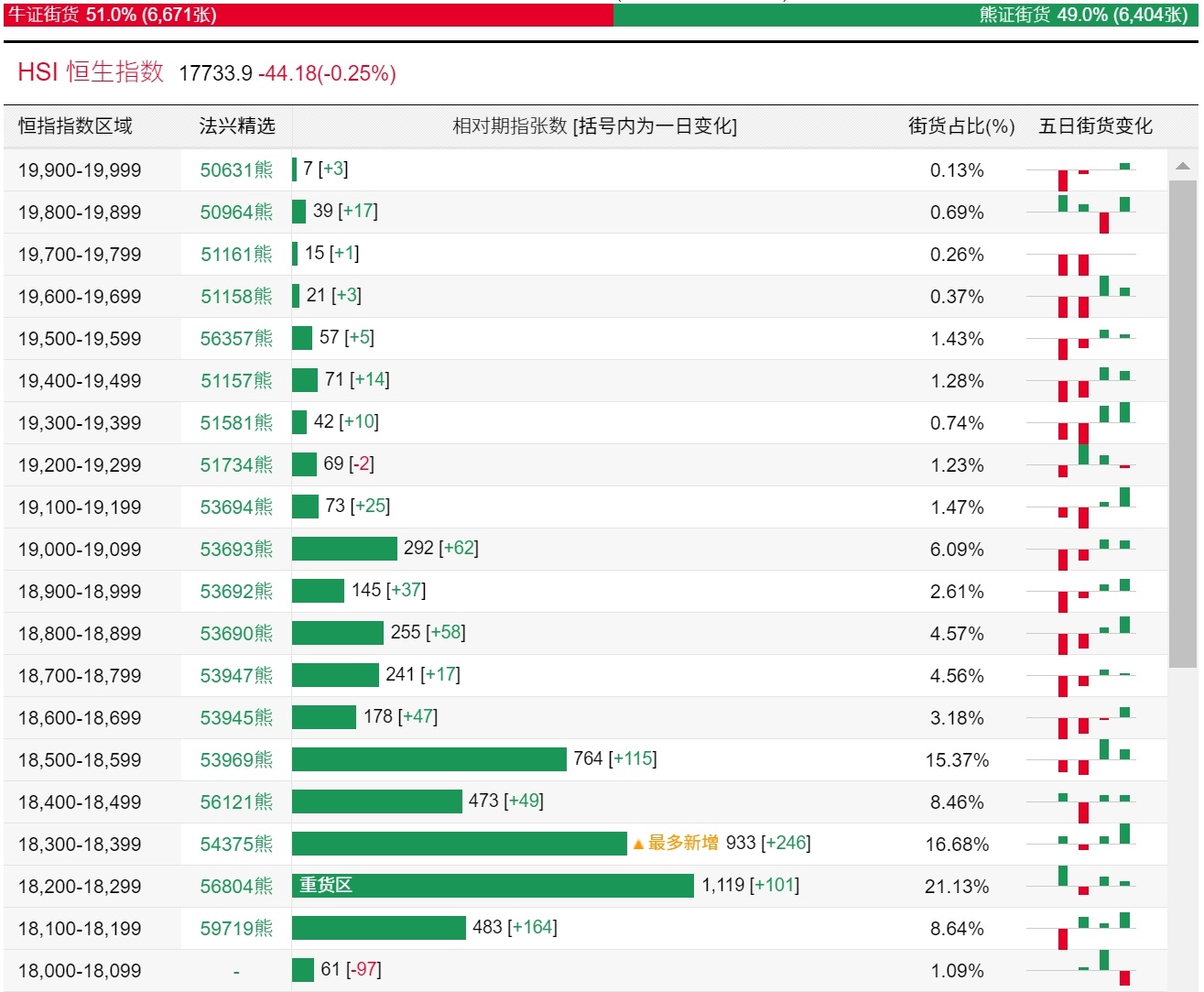 法兴恒指牛熊证街货分布图中的数据显示,熊证街货重货区在18200-18299区间,该区间最新牛证数量为1119张,较上一交易日增加101张;最多新增在18300-18399区间,该区间最新熊证数量为933张,较上一交易日增加246张。