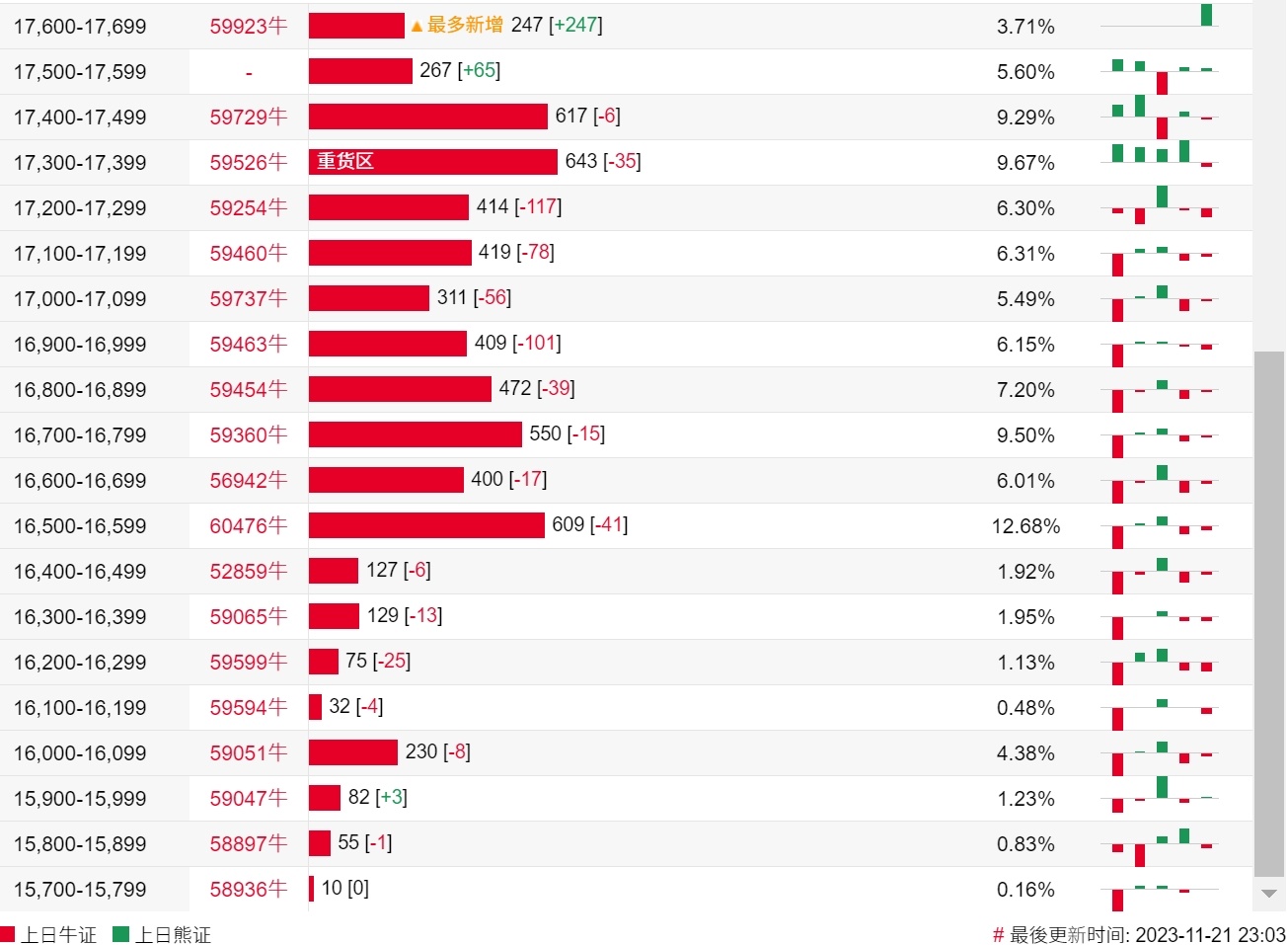 牛证街货重货区在17300-17399区间,该区间最新牛证数量为643张,较上一交易日减少35张;最多新增在17600-17699区间,该区间最新牛证数量为247张,较上一交易日增加247张。