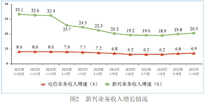 新兴业务收入保持快速增长。三家基础电信企业积极发展IPTV(网络电视)、互联网数据中心、大数据、云计算、物联网等新兴业务,1—10月份共完成业务收入3012亿元,同比增长20.5%,在电信业务收入中占比21.3%,拉动电信业务收入增长3.9个百分点。其中云计算和大数据收入同比增速分别达41.5%和41.4%,物联网业务收入同比增长21.2%。