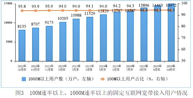 固定宽带接入用户规模稳步增长,千兆用户数持续扩大。截至10月末,三家基础电信企业的固定互联网宽带接入用户总数达6.33亿户,比上年末净增4342万户。其中,100Mbps及以上接入速率的固定互联网宽带接入用户达5.97亿户,占总用户数的94.3%,占比较上年末提升0.4个百分点;1000Mbps及以上接入速率的固定互联网宽带接入用户达1.5亿户,比上年末净增5797万户,占总用户数的23.7%。在高速率用户持续增长拉动下,家庭户均接入带宽达440.3Mbps/户,同比增长24.6%。
