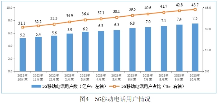 移动电话用户规模稳中有增,5G用户快速发展。截至10月末,三家基础电信企业的移动电话用户总数达17.26亿户,比上年末净增4214万户。其中,5G移动电话用户达7.54亿户,比上年末净增19360万户;占移动电话用户的43.7%,占比较上年末提高10.4个百分点。