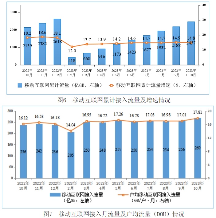 移动互联网流量保持较快增长,10月DOU值创新高。1—10月份,移动互联网累计流量达2456亿GB,同比增长14.8%。截至10月末,移动互联网用户数达15.12亿户,比上年末净增5853万户。10月当月户均移动互联网接入流量(DOU)达到17.81GB/户·月,同比增长10.5%,较上年12月份高1.63GB/户·月。