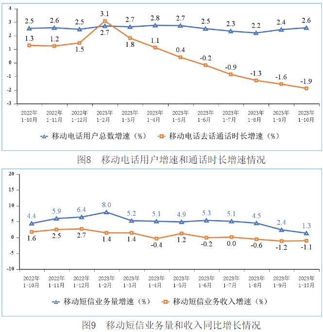 移动语音和短信业务持续收缩。1—10月份,移动电话去话通话时长完成1.87万亿分钟,同比下降1.9%;固定电话主叫通话时长完成664.7亿分钟,同比下降4.5%。1—10月份,全国移动短信业务量同比增长1.3%,增速较前三季度回落1.1个百分点;移动短信业务收入同比下降1.1%,降幅较前三季度收窄0.1个百分点。