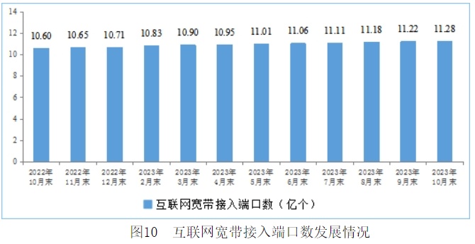 千兆光纤宽带网络建设持续推进。截至10月末,全国互联网宽带接入端口数量达11.28亿个,比上年末净增5675万个。其中,光纤接入(FTTH/O)端口达到10.86亿个,比上年末净增6097万个,占互联网宽带接入端口的96.3%。截至10月末,具备千兆网络服务能力的10G PON端口数达2216万个,比上年末净增693万个。