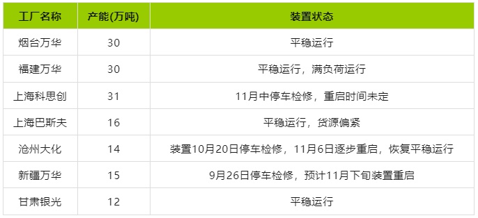 本周期国内TDI市场弱势整理运行,价格先跌后涨。11月上半月,国内下游入市积极性表现平淡,市场交投氛围偏弱,供方消息面安静,贸易市场心态悲观,持货商出货不畅,TDI报盘不断下移。15日开始上海大厂装置停车、封盘消息释放,现货填充有所收紧,贸易市场根据供方消息指引,报盘止跌回涨,但由于下游拿货情绪依旧偏淡,贸易商信心不足,TDI交投重心仅小幅上调。