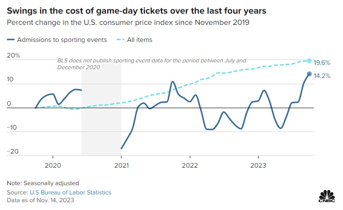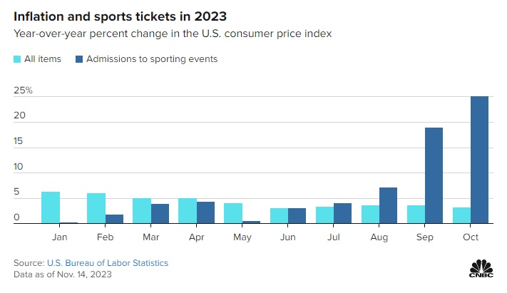 根据美国劳工统计局公布的消费者价格指数(CPI)数据,2023年10月,体育赛事门票价格同比上涨25.1%。在构成通胀指标的几百个类别中,这一类别的年化通胀率最高。整体CPI年化涨幅则相对温和,为3.2%。该指数追踪了包括牛奶、珠宝和机票在内的一篮子商品的价格。