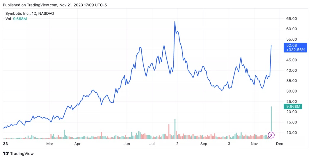 智通财经APP获悉,由沃尔玛(WMT.US)和软银(SFTBY.US)支持的仓库自动化系统制造商Symbotic(SYM.US)公布了创纪录的营收。受此影响,Symbotic周二美股收涨40.15%,报52.08美元。今年迄今为止,Symbotic的股价已经上涨了两倍多。