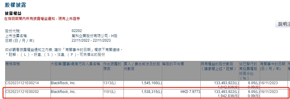 智通财经APP获悉,香港联交所最新资料显示,11月16日,贝莱德增持万科企业(02202)153.8315万股,每股作价7.9773港元,总金额约为1227.16万港元。增持后最新持股数目约为1.33亿股,最新持股比例为6.05%。