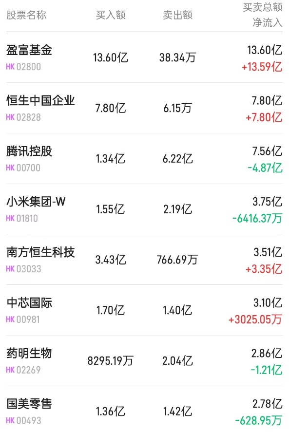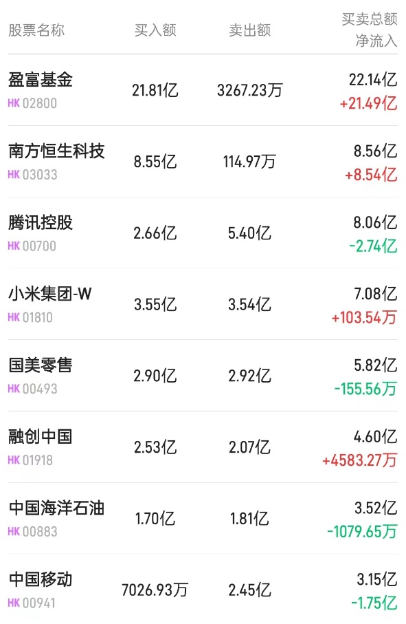 北水净买入最多的个股是盈富基金(02800)、南方恒生科技(03033)、恒生中国企业(02828)。北水净卖出最多的个股是腾讯(00700)、中国移动(00941)、中国海油(00883)。