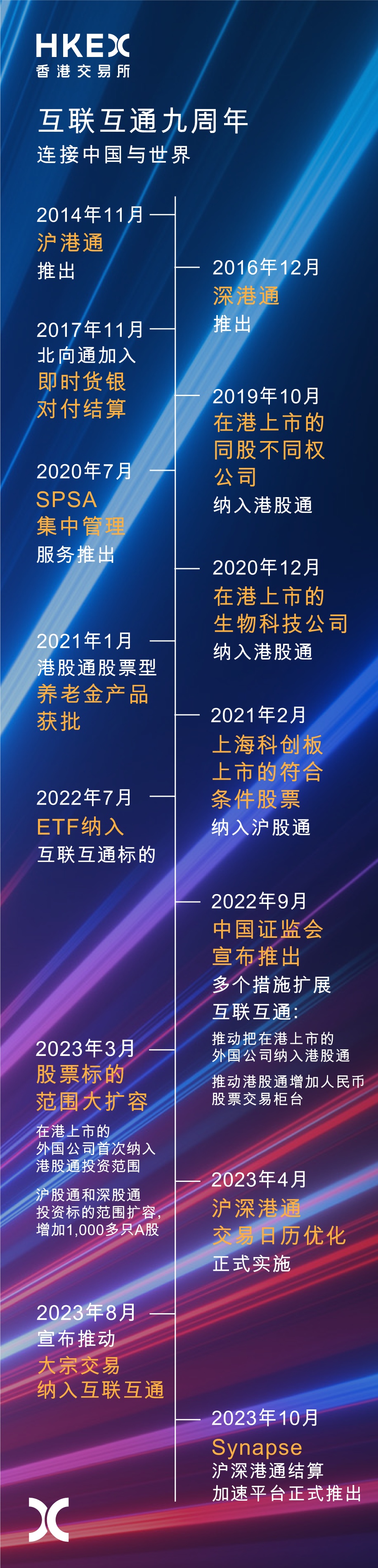 过去的九年中,香港交易所与内地交易所伙伴紧密合作,不断完善互联互通机制,为中外投资者提供便利。主要优化措施包括取消总额度限制,提升每日额度,推出南北向通投资者标识符,推出方便海外基金经理的特别独立户口集中管理服务(Master SPSA),优化交易日历,沪深港通投资标的大扩容,推出HKEX Synapse沪深港通结算流程加速平台等等。