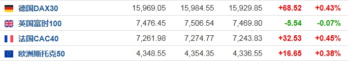 2.截至发稿,德国DAX指数涨0.43%,英国富时100指数跌0.07%,法国CAC40指数涨0.45%,欧洲斯托克50指数涨0.38%。