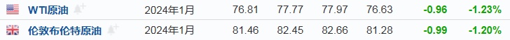 3. 截至发稿,WTI原油跌1.23%,报76.81美元/桶。布伦特原油跌1.20%,报81.46美元/桶。