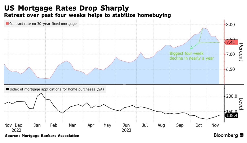 抵押贷款利率往往与美国国债收益率同步变动。由于有迹象显示经济和通胀双双降温,10年期美国国债收益率在10月触及16年高点后,本月大幅下滑。