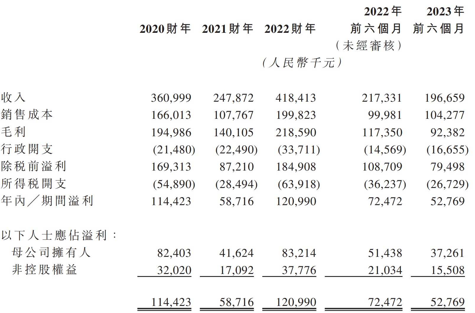 财务方面,于2020年、2021年、2022年以及2023年6月30日止六个月,集海资源实现总收入分别约为人民币3.61亿元、2.48亿元、4.18亿元、1.97亿元;同期,公司实现年内溢利分别为人民币1.14亿元、5871.6万元、1.21亿元、5276.9万元。