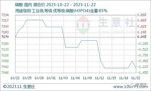 智通财经APP获悉,据生意社商品行情分析系统,近期磷酸市场行情小幅波动。截止11月22日,国内85含量热法磷酸参考均价为7080元/吨,较11月1日参考均价7200元/吨,下跌近2%;国内85含量湿法磷酸参考均价为6883元/吨,较11月1日参考均价6950元/吨,下跌1%。生意社认为,近日磷酸价格小幅调整。原料行情涨跌互现,磷酸成本支撑有限,下游需求表现不佳,按需采购为主。预计短期磷酸市场偏弱运行为主。