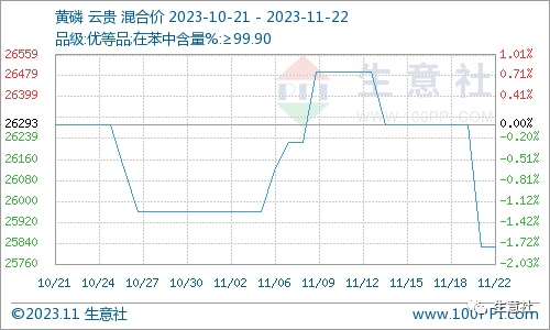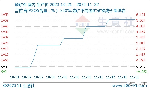 原料磷矿石方面,近期国内磷矿石市场行情整体稳中再度小幅向上运行。贵州地区部分矿企窄幅上调中高端品位磷矿石价格,上调幅度20-30元/吨左右,场内低价货源减少,高低价差缩小。截止11月22日,国内30品位磷矿石市场价格参考1000-1100元/吨左右,偏高价格参考1150元/吨附近。