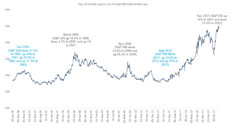 智通财经获悉,加拿大皇家银行资本市场周三表示,目前标普500指数中市值最大的10家公司的集中度继续创下新高。然而,该公司并不认为这为未来提供了一个明确的信号。加拿大皇家银行资本市场解释说:“集中度与过去的市场压力时期有关,但信号不明确。随着2000年和2021年底互联网泡沫的破裂,十大公司的集中程度变得极端;这两件事之后,股市都承受了巨大压力。但事实并非总是如此。1991年和2012年出现的集中度都是在股市极度紧张的时期之后出现的。2008年出现的集中化,是在股市压力已经开始很久之后出现的。”