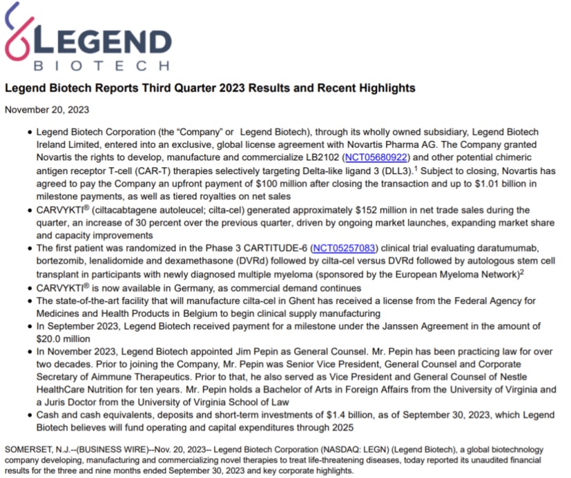 11月13日,传奇生物宣布与诺华就特定靶向DLL3的嵌合抗原受体T细胞(CAR-T)疗法签订独家全球许可协议.传奇生物将获得1亿美元的预付款,并有资格获得高达10.1亿美元的临床、监管和商业里程碑付款以及分级特许权使用费。