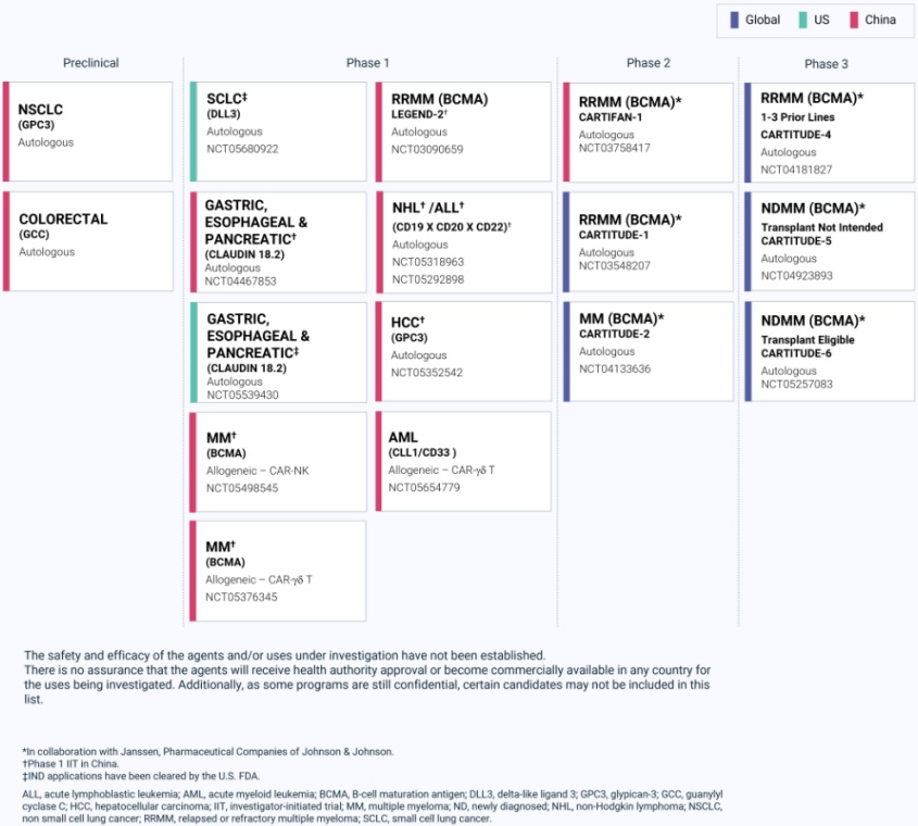 作为全球知名的CAR-T药物研发企业,传奇生物最为人所知的莫过于BCMA CAR-T疗法Carvykti,但实际上公司在自体疗法领域除了BCMA CAR-T外还布局了GPC3、CLDN18.2、DLL3,而在同种异体疗法领域则布局了BCMA、CLL1/CD33等靶点。