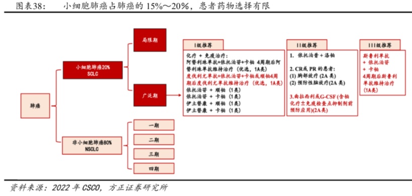 因为该靶点药物针对的小细胞肺癌适应症占全部肺癌类型的15%-20%,是侵袭性高、预后最差的类型之一,大约7成患者确诊时已进展为广泛期小细胞肺癌(ES-SCLC),丧失手术机会。而目前针对既往ES-SCLC标准治疗方案,仅仅只是卡铂、顺铂等铂类药物联合依托泊苷的化疗方案,中位总生存期始终未突破1年,存在极大的未满足治疗需求。