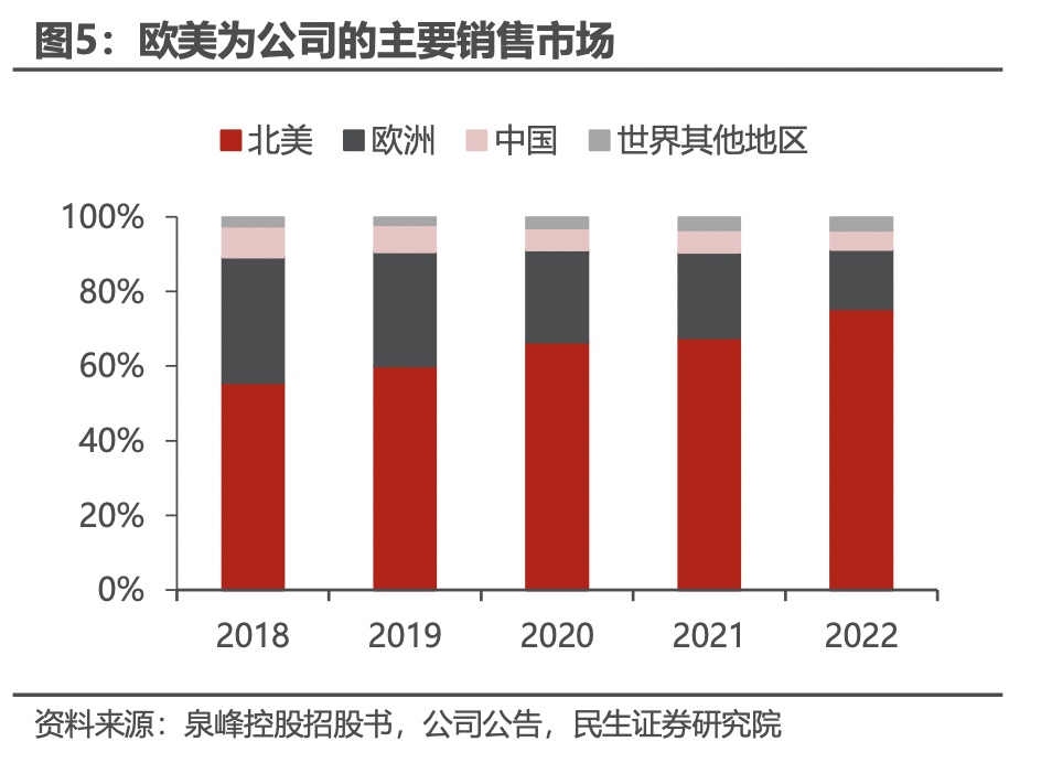 分地区来看,公司业务主要集中于北美及欧洲地区,截至2022年,公司北美地区营业收入占比已有2018年的55.6%进一步提升至2022年的75.4%。而欧洲市场则由于较高电动工具业务增速相对较慢,营收占比由 2018 年的 33.7%下滑至 2022 年的 15.9%,但仍为公司第二大市场。此外,中国及世界其他地区的营收占比为 10%。
