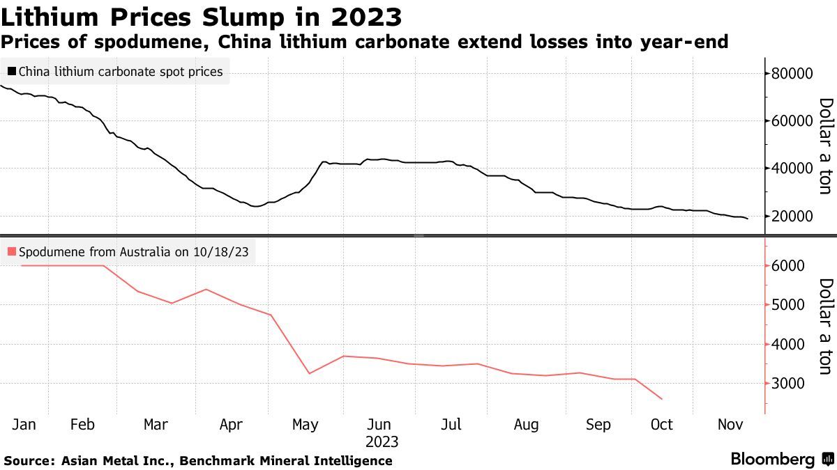 在前几年价格飙升后,供应过剩在2023年给锂价带来了压力。根据行业咨询公司Benchmark Mineral Intelligence的预测,全球锂市场要到2028年才会恢复短缺状态。与此同时,利率上升也加剧了全球电动汽车需求的不确定性,一些汽车制造商正在重新考虑它们的电气化战略。