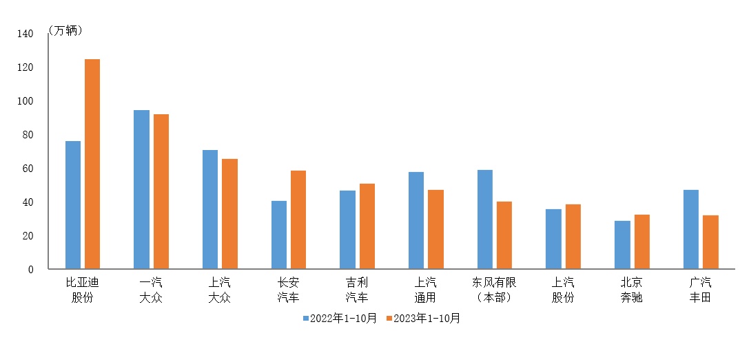 智通财经APP获悉,11月24日,据中汽协数据显示,2023年1-10月,销量排名前十位的轿车生产企业共销售581万辆,占轿车销售总量的63.7%。在上述十家企业中,与上年同期相比,比亚迪股份(002594.SZ)、长安汽车(000625.SZ)和北京奔驰呈两位数较快增长,吉利汽车(00175)和上汽股份(600104.SH)小幅增长,其他企业呈不同程度下降。