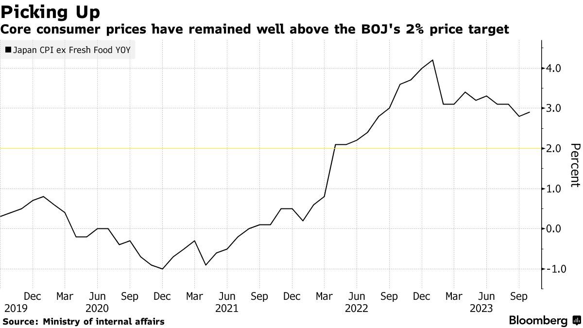 智通财经APP获悉,日本的关键通胀指标4个月来首次加速上涨,这与市场对物价将继续上涨的预期相符,使得依赖数据的日本央行在12月政策会议上转向鹰派的可能性提高,明年年初结束负利率政策的市场预期则持续升温。日本内务省周五公布的数据显示,10月份不含新鲜食品的核心消费者价格指数(CPI)增幅从9月份的2.8%微升至2.9%,略低于经济学家们预测中值3%,日本通胀数据已经连续19个月高于日本央行2%这一锚定目标。