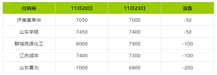 成本面,11月国际原油期货价格整体下滑走势,截止11月23日,美国WTI原油期货主力合约结算价报77.10美元/桶,跌幅为0.67美元或0.9%,布伦特原油期货主力合约结算价报81.25美元/桶,跌幅0.49美元或0.6%。纯苯受原油影响市场行情偏弱震荡为主,截止11月23日,目前厂家报价范围在7493-7750元/吨左右,部分企业价格下调。近期环己烷市场成本面支撑有限,工厂价格窄幅下滑。